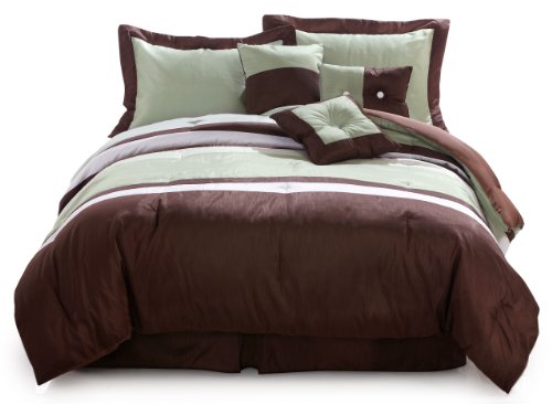 This beautiful 7-pc queen comforter set has a contemporary design incomplementary shades of green and brown Set includes 86 x 86 comforter 60 x 80 14 bed skirt two pillow shams 20 x 26 two 16 x 16 pillows 16 x 7 oblong pillow PolyCotton Bealls Exclusive Imported